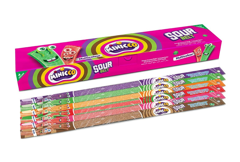 Мармеладные ремешки “MINICCO SOUR BELT” (Фруктовое ассорти) 6*60*15г — изготавливается в Турции по нашему заказу. Технология использования проверена временем — только качественные ингредиенты и натуральные красители.