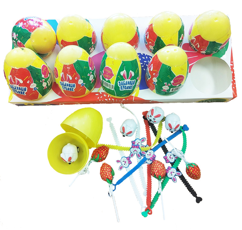 Пластиковое яйцо с карамелью и игрушкой “Забавный Кролик” 8*10*28г нашего производства. “Забавный Кролик” - это замечательная серия игрушек, в яйце-сюрпризе очень нравится детям, ведь всегда так интересно, какая игрушка попадется на этот раз. Каждая новая игрушка вызывает море положительных эмоций у ребенка.