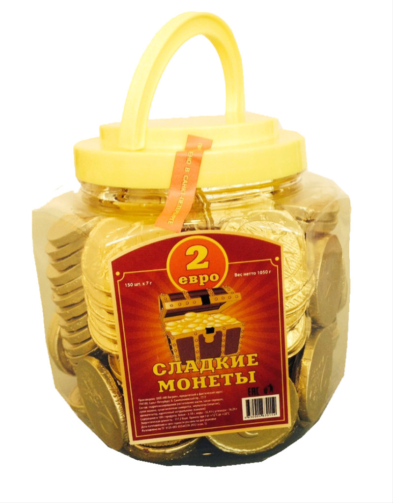 Каждая шоколадная монета упакована в индивидуальную фольгу, что делает продукт гигиеничным, удобным для продажи и раздачи. Такая яркая фольга на шоколадных монетах “2 евро” эффектно смотрятся на витрине, в подарочных наборах и на сладком столе, привлекая внимание покупателей и создавая атмосферу праздника.