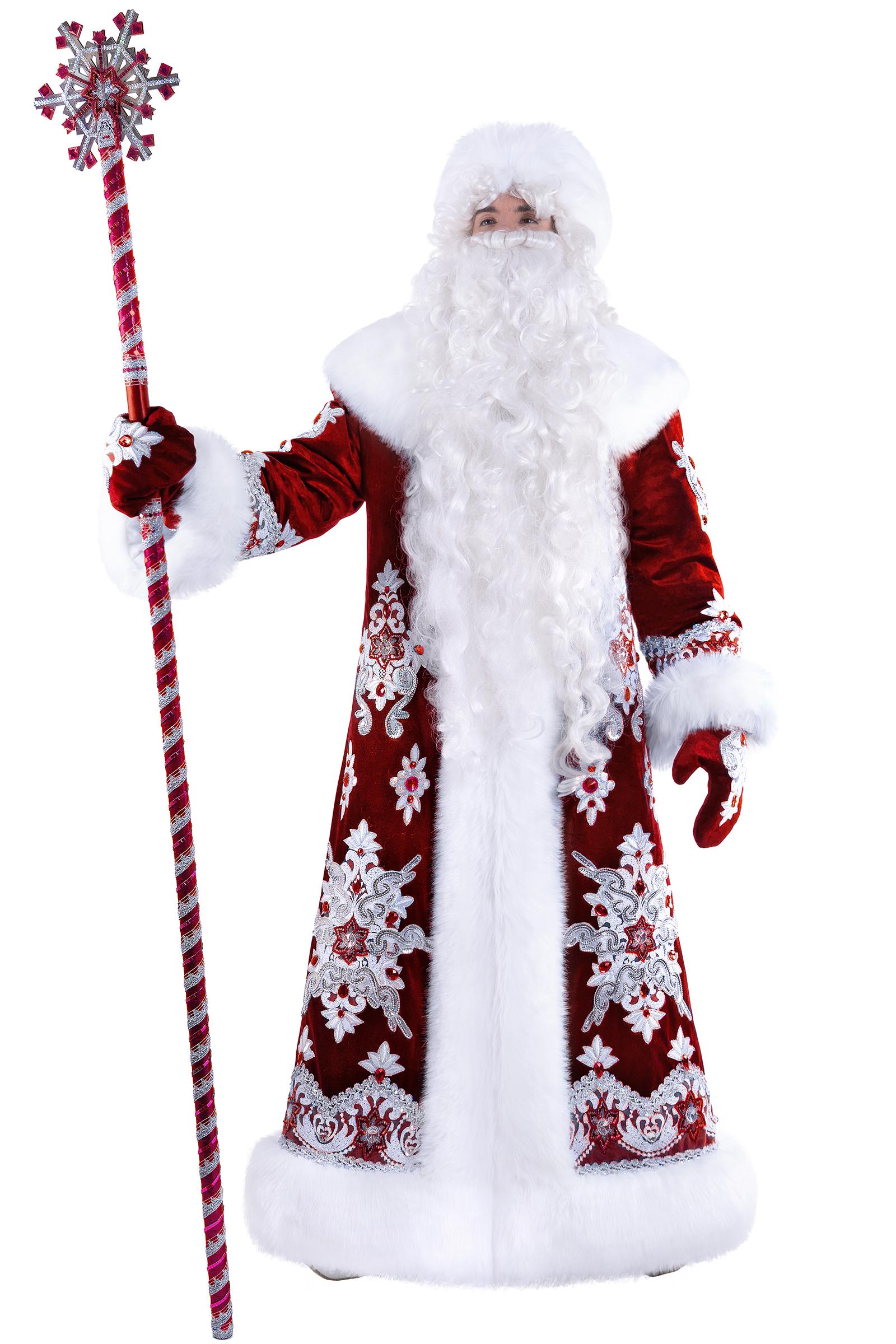 Костюм Деда Мороза — сценический комплект из тёмно-красного бархата с белым мехом и ручным декором в виде морозных узоров. Включает длинную расклёшенную шубу с пелериной-воротником и богато украшенными рукавами. Каждый костюм выполняется с индивидуальным авторским декором.