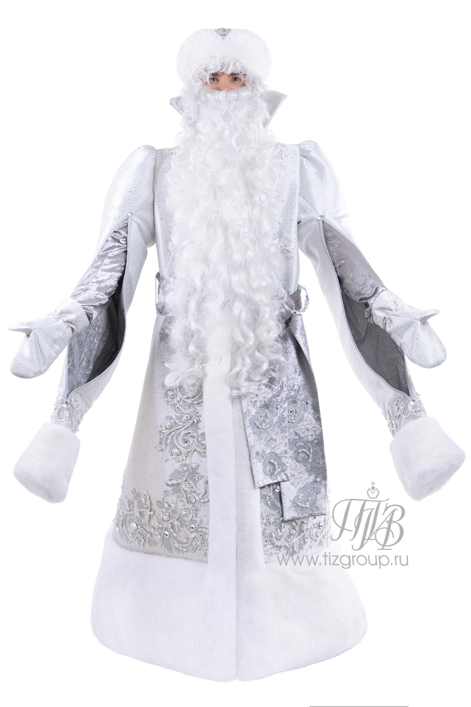 Костюм Деда Мороза «Архангельск серебряный», мод. № 26 — сценический комплект из серебристой парчи с растительным узором, украшенный ручной вышивкой, искусственным жемчугом и стразами. В набор входят шуба, шапка и рукавицы. Каждый костюм уникален благодаря авторскому декору.