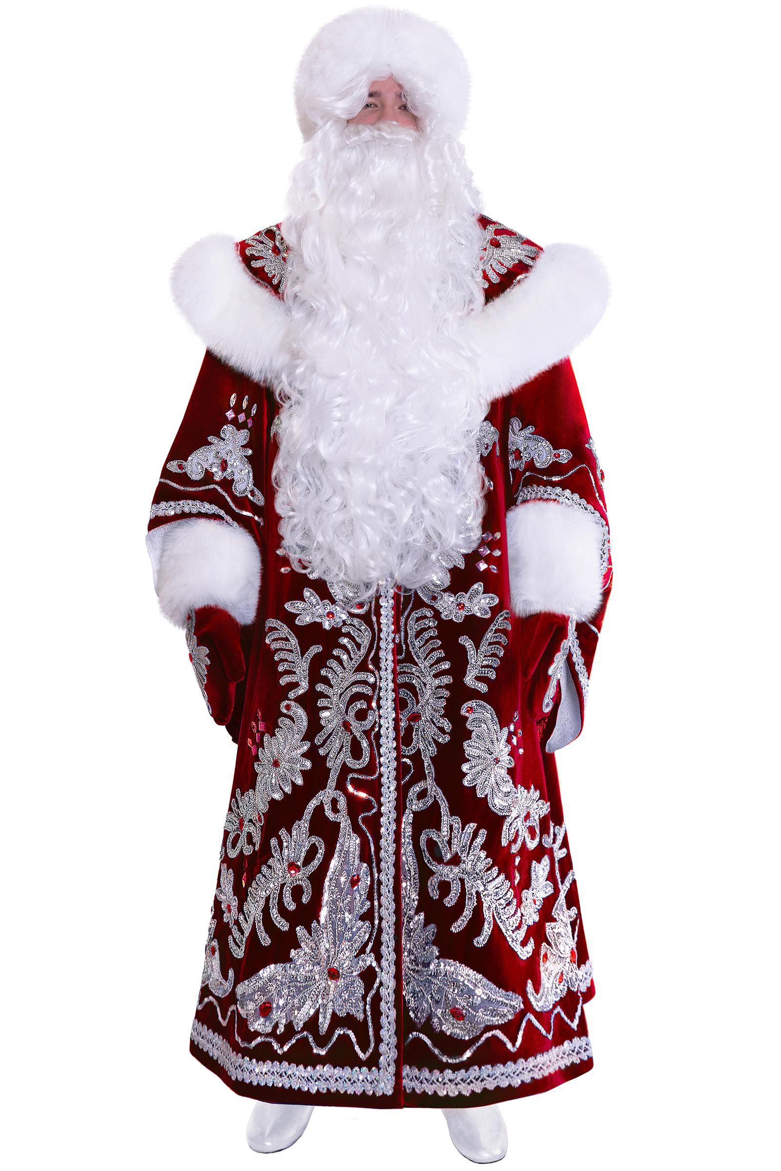 Костюм Деда Мороза — сценический комплект из тёмно-красного бархата с белым мехом и ручной вышивкой аппликациями и стразами. Включает шубу в стиле боярского кафтанa, шапку и рукавицы. Каждый костюм уникален благодаря индивидуальному авторскому декору.