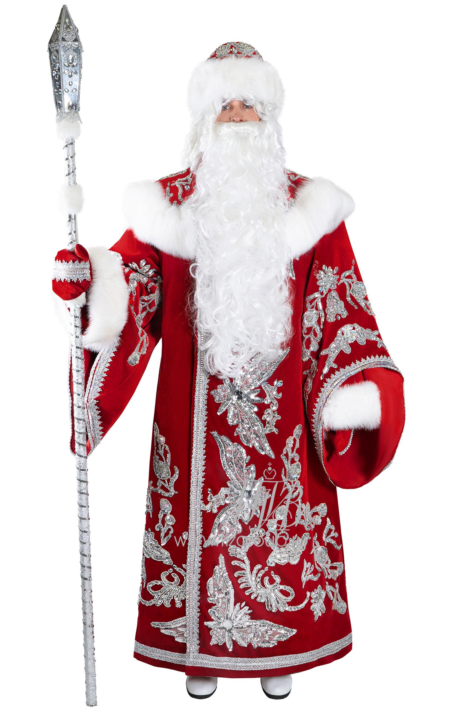 Костюм кремлевского Деда Мороза, мод. № 28 — роскошный комплект из красного бархата с натуральным мехом песца. В набор входят шуба с богато декорированными рукавами, шапка и рукавицы. Все элементы украшены авторскими аппликациями и вручную пришитыми стразами, каждый костюм уникален. Наценка на размеры от 56 — 30%.