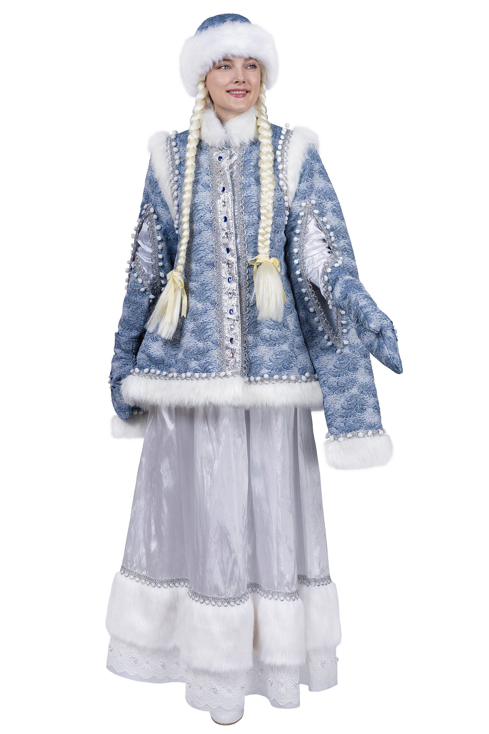 Профессиональный сценический костюм Снегурочки в традиционном русском стиле предназначен для театров, творческих коллективов и event-агентств. Комплект включает душегрею с длинными боярскими рукавами, нижнее платье и рукавицы. Костюм выполнен из бело-голубого жаккарда, итальянской тафты и атласа, с отделкой мехом под норку, серебряной тесьмой и кристаллами. Душегрея имеет приталенную спинку со шнуровкой для точной посадки, воротник-стойку и декоративные элементы в серебряной гамме. Нижнее платье трапециевидного силуэта украшено кружевом и жемчужинами по подолу. Костюм отвечает сценическим требованиям, доступен к индивидуальному пошиву и поставляется по всей России.