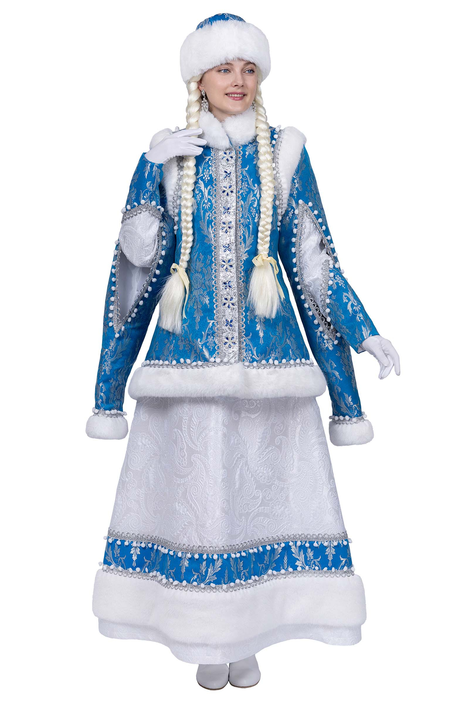 Костюм Снегурочки включает полушубок и длинное платье из бирюзовой парчи с серебристым декором. Полушубок с меховой оторочкой, длинные рукава с прорезями, застёжка на кнопки. Платье трапециевидное с декоративной каймой и длинными рукавами. Каждый костюм уникален, декор выполнен вручную. Доступен заказ и доставка по России из Санкт-Петербурга.