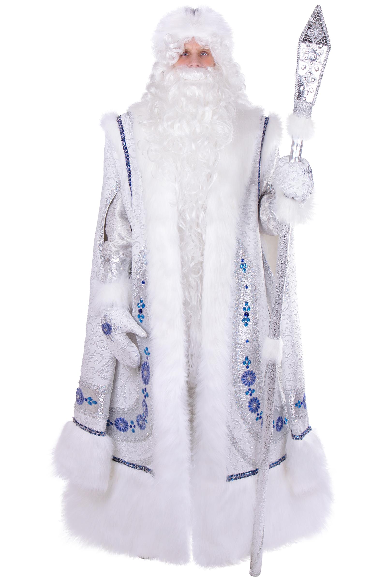 Новогодний костюм Деда Мороза — сценический комплект в боярском стиле из бархата с белым мехом и серебристым декором. Включает длинную шубу с ручными аппликациями и стразами, шапку-мурмолку и рукавицы. Каждый костюм уникален благодаря индивидуальной авторской проработке декора.