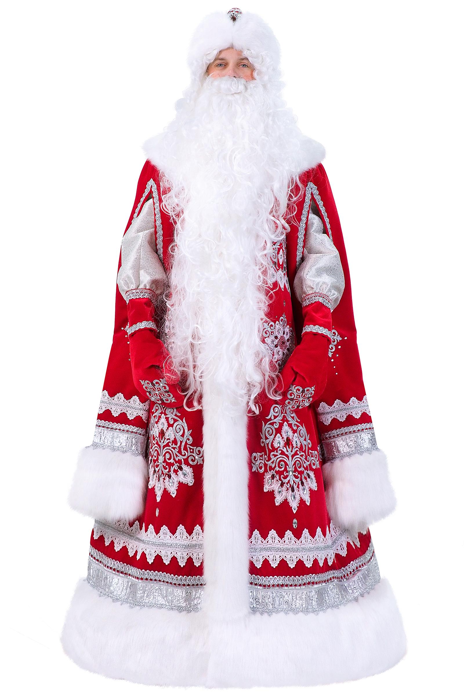 Русский Дед Мороз «Царский», шуба, мод. № 13 — роскошный сценический комплект из красного бархата с белым мехом и богатым ручным декором. В набор входят шуба, нижнее платье, шапка и рукавицы, украшенные аппликациями, стразами и камнями. Каждый костюм имеет уникальную авторскую отделку.
