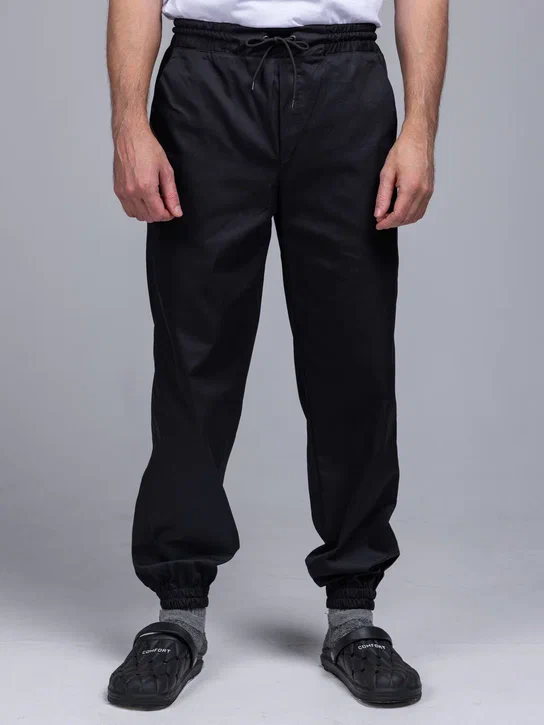 Лёгкие, стильные и практичные брюки-джоггеры на резинке внизу. На поясе - резинка, для удобства дополнена шнурком. Брюки джоггеры универсальные, унисекс, идеально садятся и на мужчин, и на женщин. 4 кармана. Хлопок 55%/ полиэстер 45%