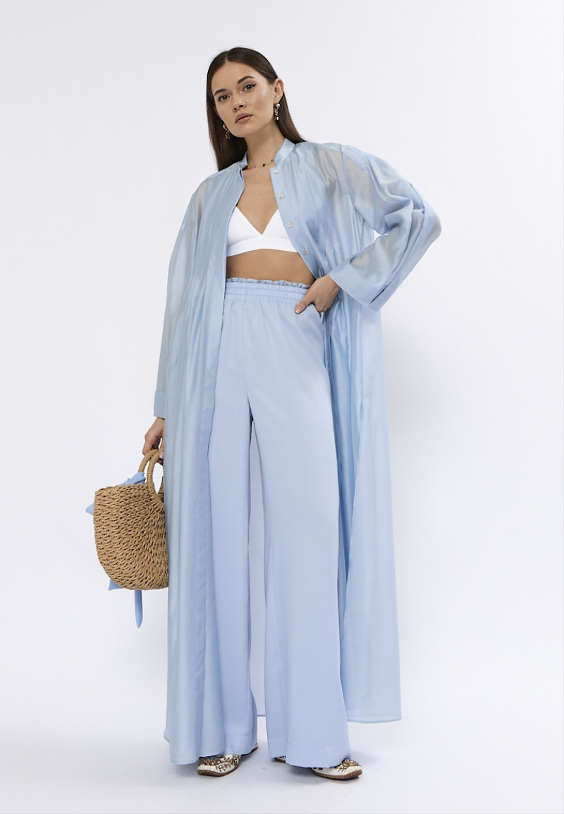 Брюки палаццо нежно-голубого цвета из органического 100% тенселя — отличный вариант для летнего сезона. Ткань отличается особенной легкостью, а свободный крой создает исключительный комфорт. Модель изящно струится при движении, облегающая посадка на бедрах формирует ниспадающий женственный силуэт. У брюк высокая посадка на комфортной эластичной резинке с декоративным элементом. Отсутствует внешний боковой шов.