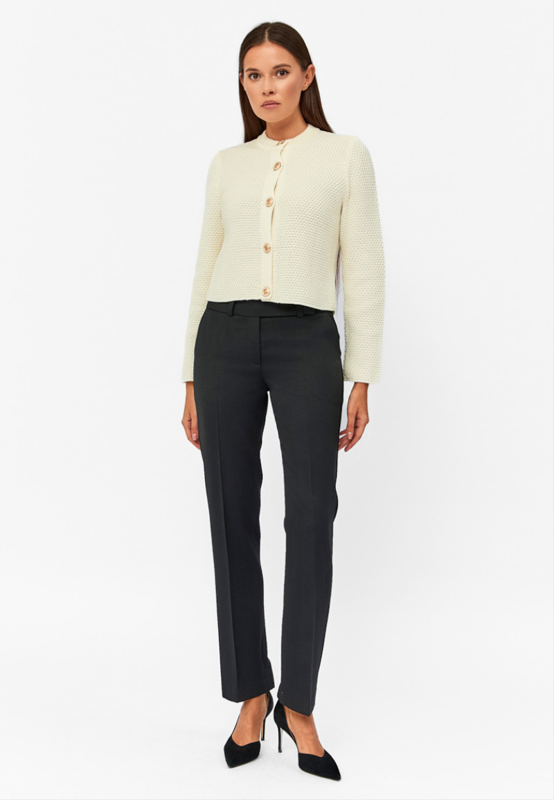 Текстура шерсти мериноса обеспечивает исключительную теплоту и воздухопроницаемость, приятное ощущение на коже и лёгкость движений. Молочный цвет держит свет и создаёт чистый, свежий силуэт, который великолепно компонуется как с юбками и брючными костюмами, так и с платьями прямого кроя.