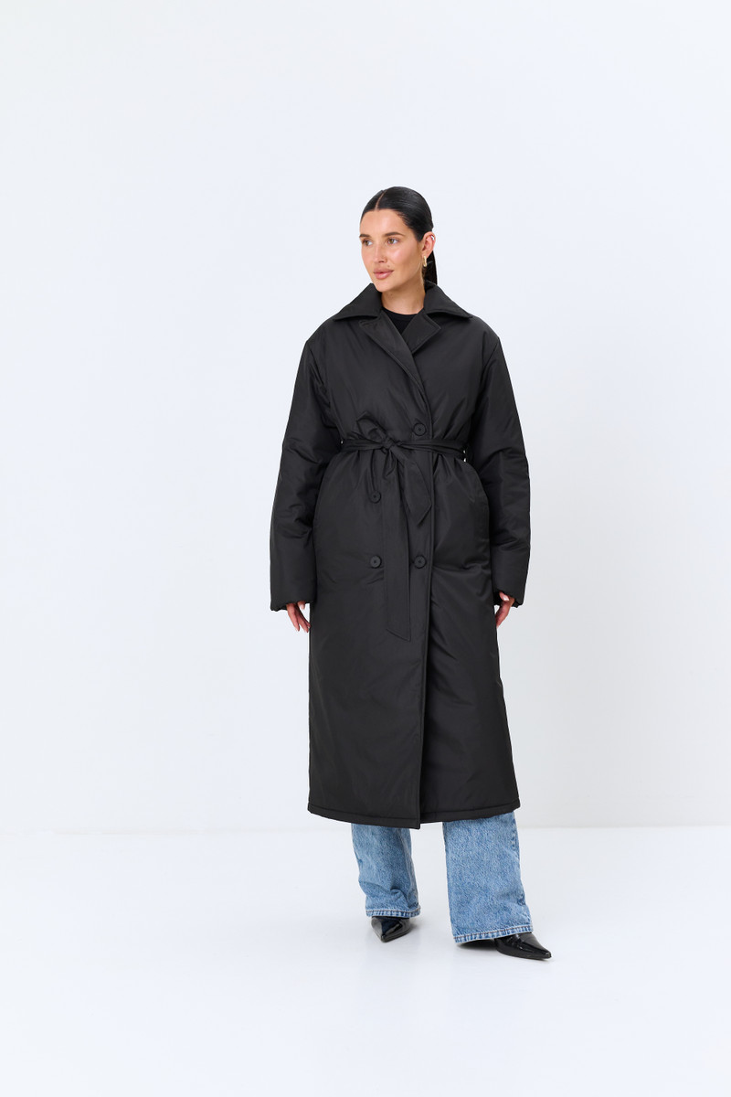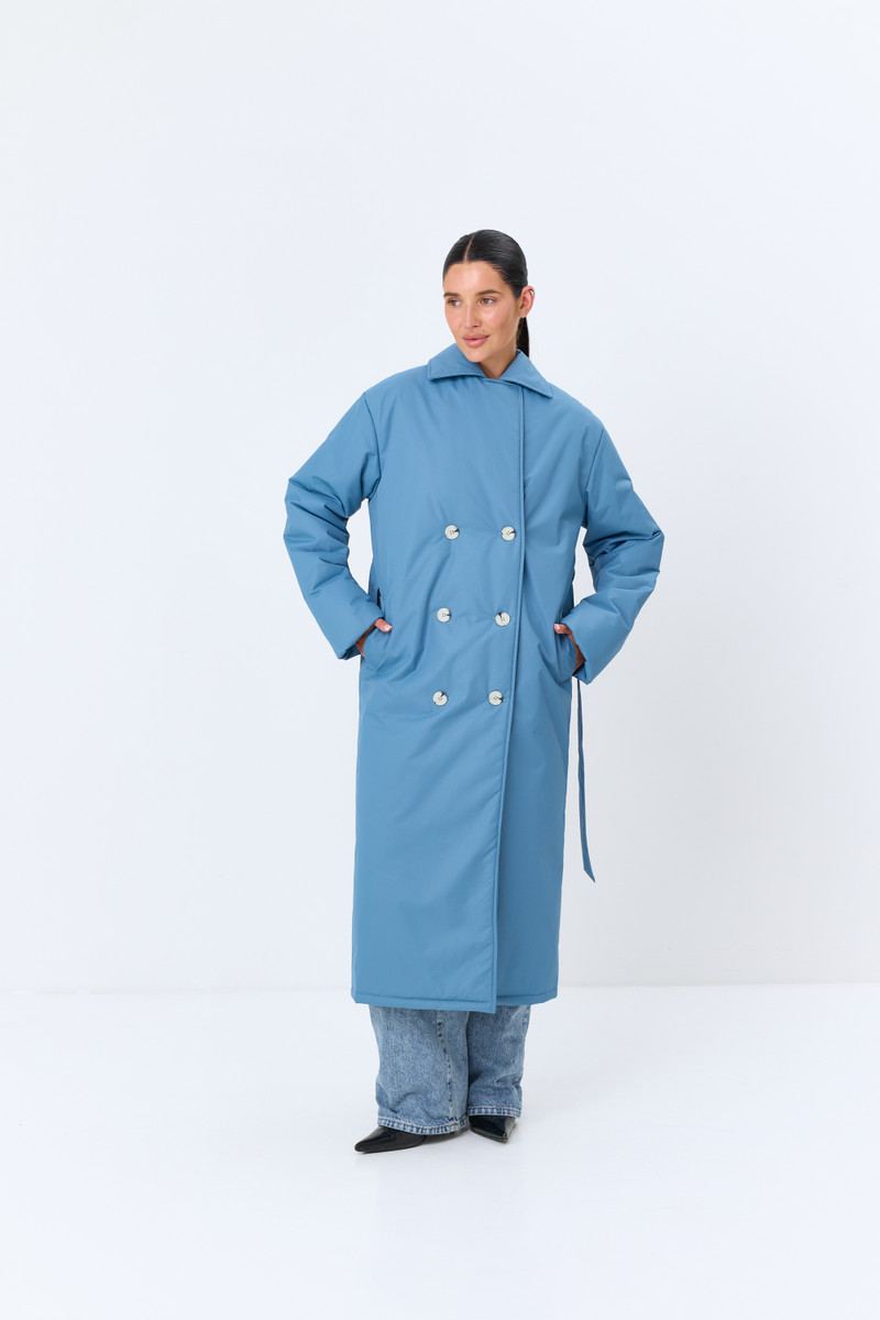 Зимнее двубортное пальто из плащевой ткани на пуговицах макси длины. Ткань верха с пропиткой от воды.