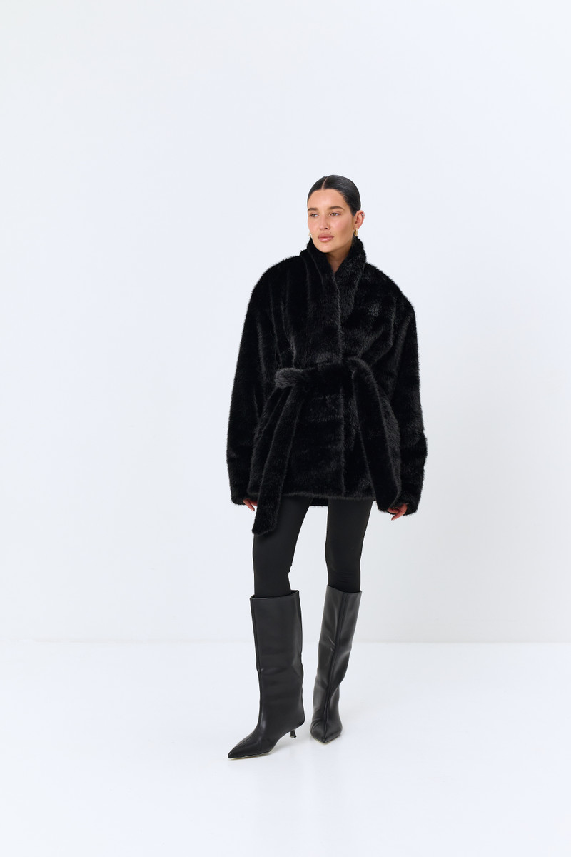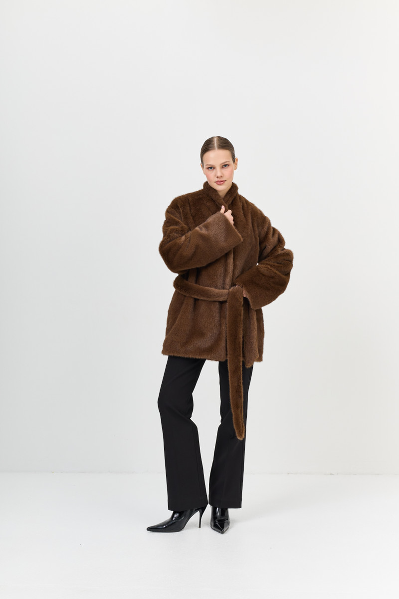 Эко шуба длины мини с воротником в стиле кимоно. Из фурнитуры: 3 шубных крючка. Карманы спрятаны в боковые швы.