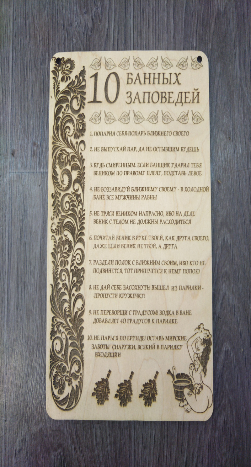 Чтобы купить Табличка 10 банных заповедей 2330 оптом по цене 66.0-99.0 руб., свяжитесь с поставщиком. Компания поставщик — Топпертоп (Самозанятый «Максимов») из города Таруса (Калужская область). Минимальная сумма оптового заказа: 5000 руб. Минимальная партия 3 шт. Доставка возможна самовывоз, транспортной компанией, автомобилем. Способы оплаты: наличными, безналичная оплата, электронные деньги.