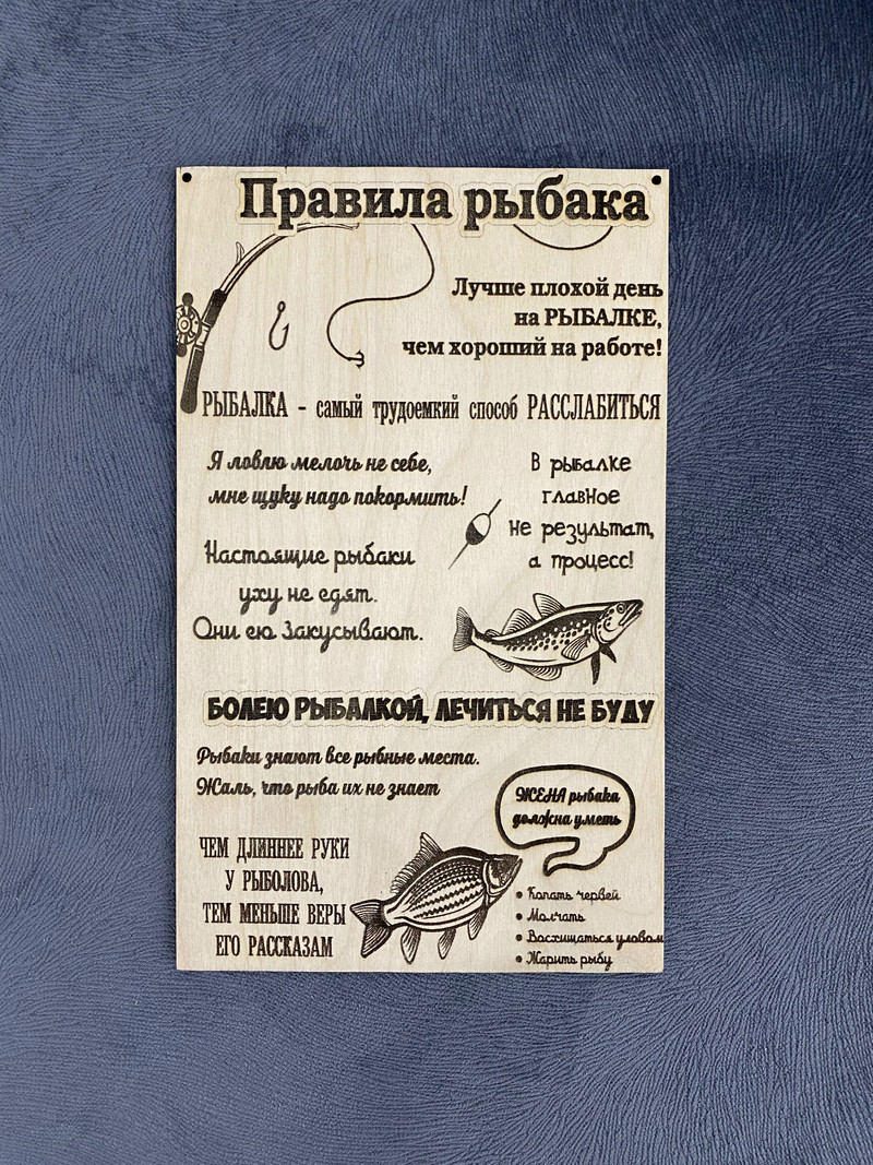 Чтобы купить Табличка Правила рыбака 2327 оптом по цене 66.0-99.0 руб., свяжитесь с поставщиком. Компания поставщик — Топпертоп (Самозанятый «Максимов») из города Таруса (Калужская область). Минимальная сумма оптового заказа: 5000 руб. Минимальная партия 3 шт. Доставка возможна самовывоз, транспортной компанией, автомобилем. Способы оплаты: наличными, безналичная оплата, электронные деньги.