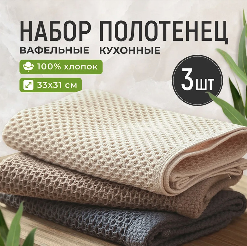 Полотенца из натурального хлопка с вафельной фактурой — мягкие, хорошо впитывают влагу и удобны в использовании. Размер 33x31 см подходит для рук и повседневных кухонных задач. Нейтральные цвета легко вписываются в любой интерьер, есть петелька для подвешивания. Практичный вариант для кухни и отличный подарок.