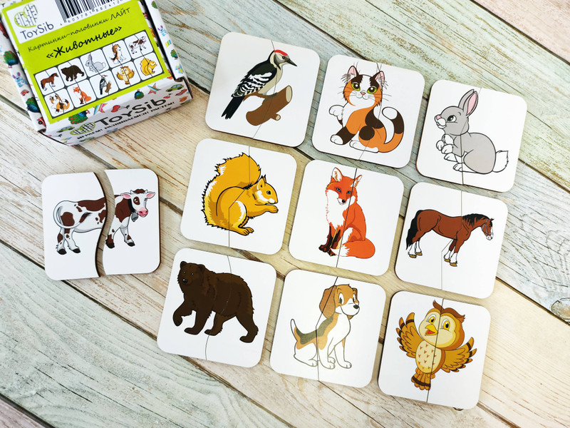 Задача ребенка — соединить половинки так, чтобы получились целые картинки с изображением животных.
