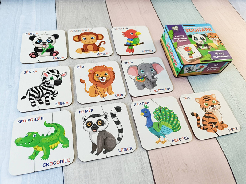 Задача ребенка — соединить половинки так, чтобы получились целые картинки с изображением животных.