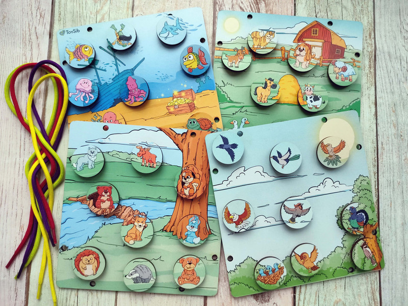 Задача ребенка, опираясь на логику, подобрать и расклеить фишки на 4 планшета. На планшетах изображены 4 разных среды обитания птиц, животных, рыб и т.д.