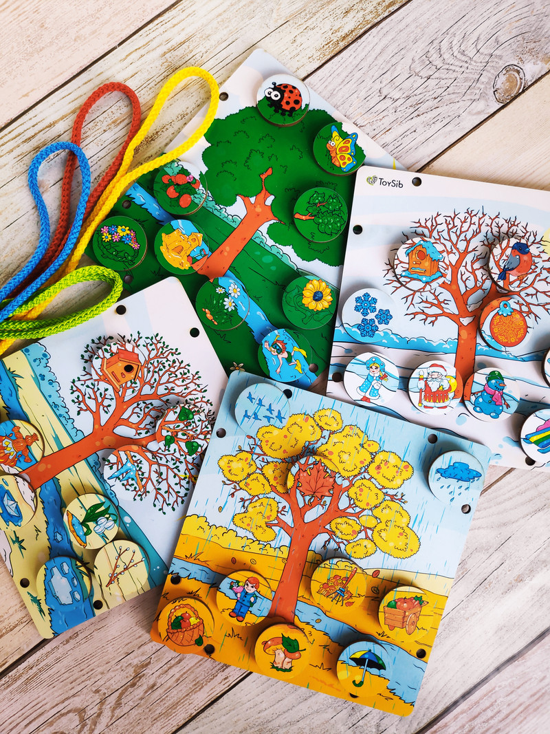 Задача ребенка, опираясь на логику, подобрать и расклеить фишки на 4 планшета с изображениями времен года.
