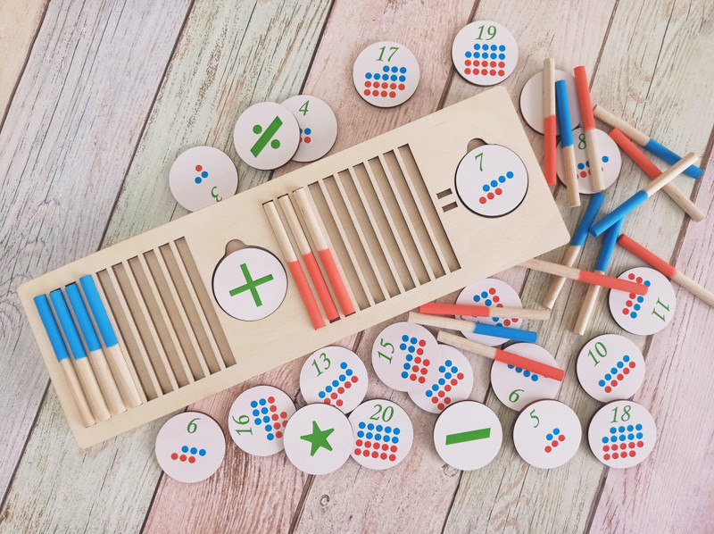 Положите в лунки игровой панели справа синие палочки, слева красные и по центру фишку с математическим знаком. Попросите ребенка посчитать синие и красные палочки и подобрать фишку с правильным ответом.