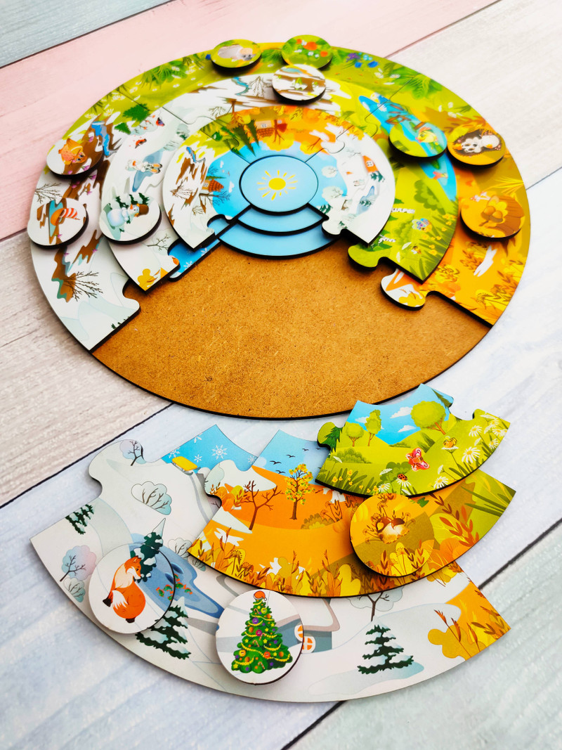 Задача малыша собрать на игровом поле три яруса пазла в последовательности смены времен года, подобрать и расклеить фишки на нижнем и среднем ярусах.