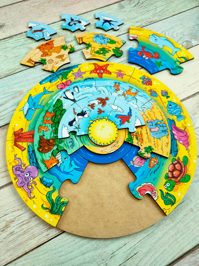 Пазл представляет собой пирамиду из трех ярусов: море, суша, небо.