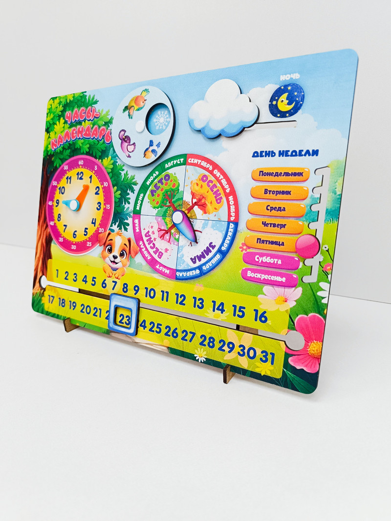 Развивающая игра “Календарь” - это многофункциональная игрушка, которая превратит сложные темы в понятную и любимую игру. С её помощью малыш легко разберется в часах, днях недели, месяцах и временах года, а также научится отмечать погодные явления.