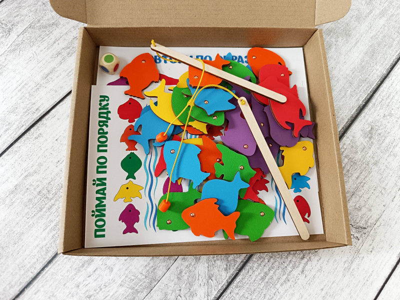 - Попросите ребенка поймать нужное количество рыбок и разложить их в порядке, указанном на карточке.