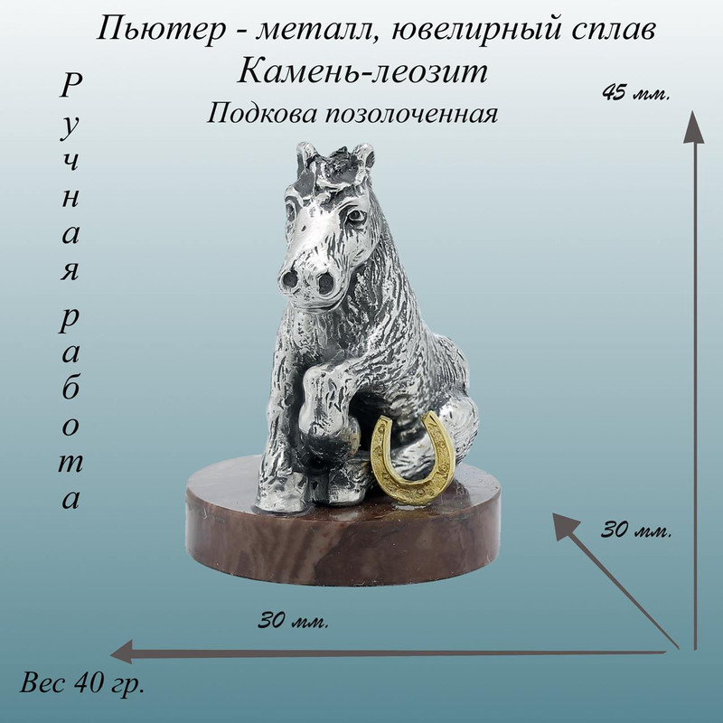 • Статуэтка лошадь — символ года 2026 из пьютера, известного как “английское серебро”, будет отличным новогодним подарком и для мужчины, и для женщины: как для шефа или бизнес-партнера, так и для близкого человека — мамы, папы, мужа или жены, брата, сестры, дочки и сына, друга или подруги. Оригинальная фигурка лошади изготовлена ювелирами по авторскому эскизу. Подставка сделана из натурального камня, а подкова, символ удачи, покрыта настоящей позолотой. Подарите нашу лошадь на Новый год другу, родившемуся в год лошади — статуэтка станет его талисманом и принесет удачу и благополучие.
