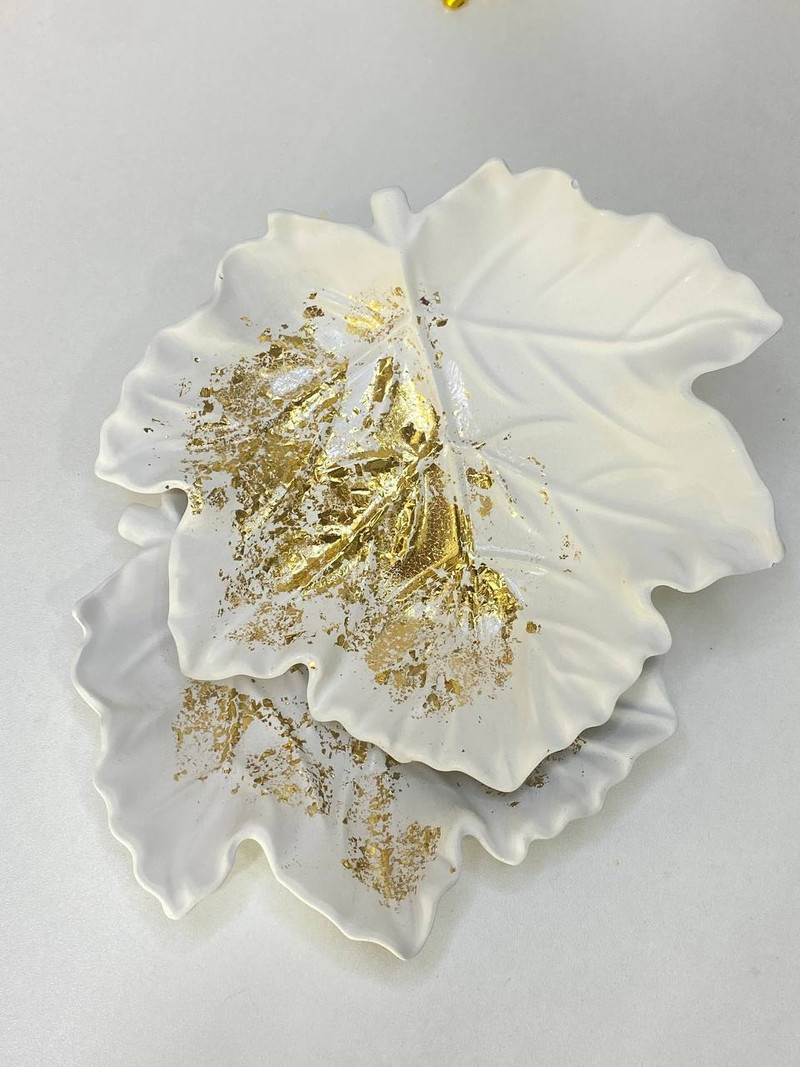 Кленовый лист — форма для свечи, белый гипс с рельефными прожилками и золотой поталью.