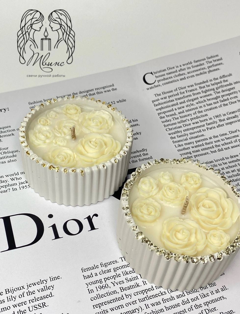 Кремовая Роза — нежная свеча в ребристом гипсовом кашпо, где восковые розы кремового оттенка тают в тёплом сиянии.