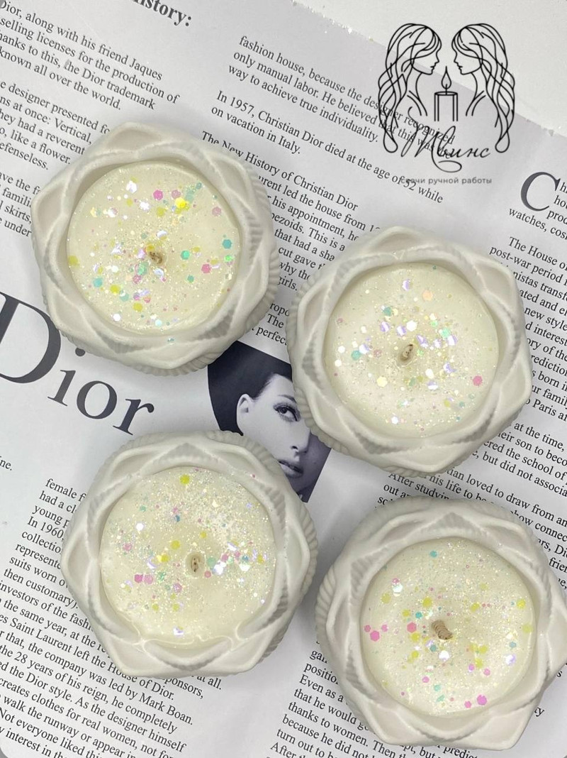 Лотос — нежная свеча в ребристом гипсовом кашпо, где кремовый воск переливается разноцветным глиттером, словно лепестки лотоса на утренней росе.