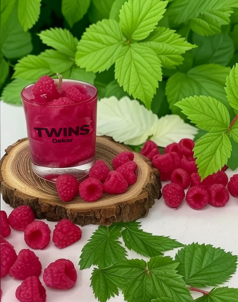 Малинки — ягодная свеча в прозрачном стакане, где насыщенный малиновый воск усыпан сочными восковыми ягодами, будто свежесобранный урожай в утренней росе.