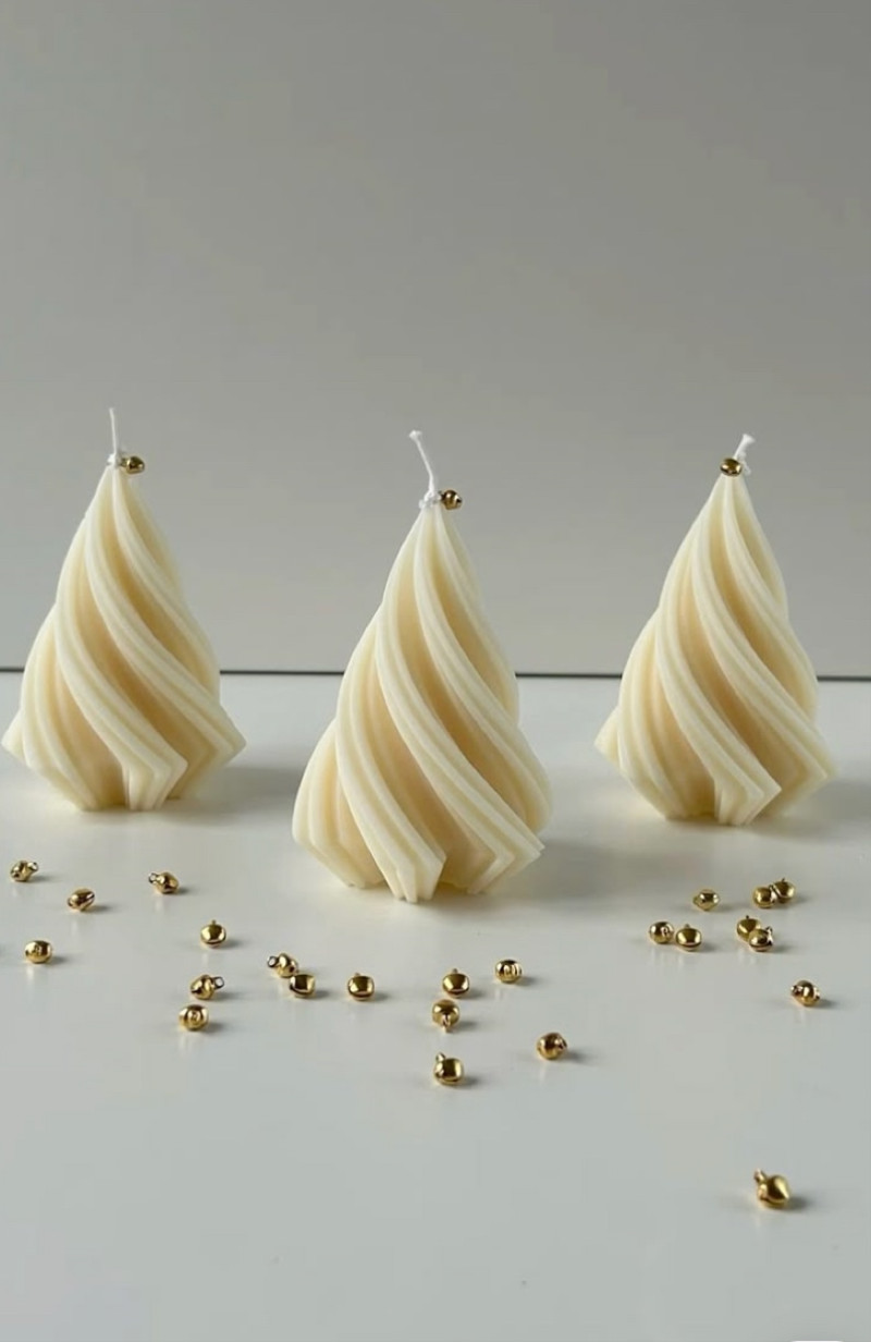 Новогодняя Ель — милая свеча в форме спиральной елочки с плавно закрученными ветвями, где воск сияет мягким светом, словно искрится под лунным сиянием в тихом зимнем лесу.