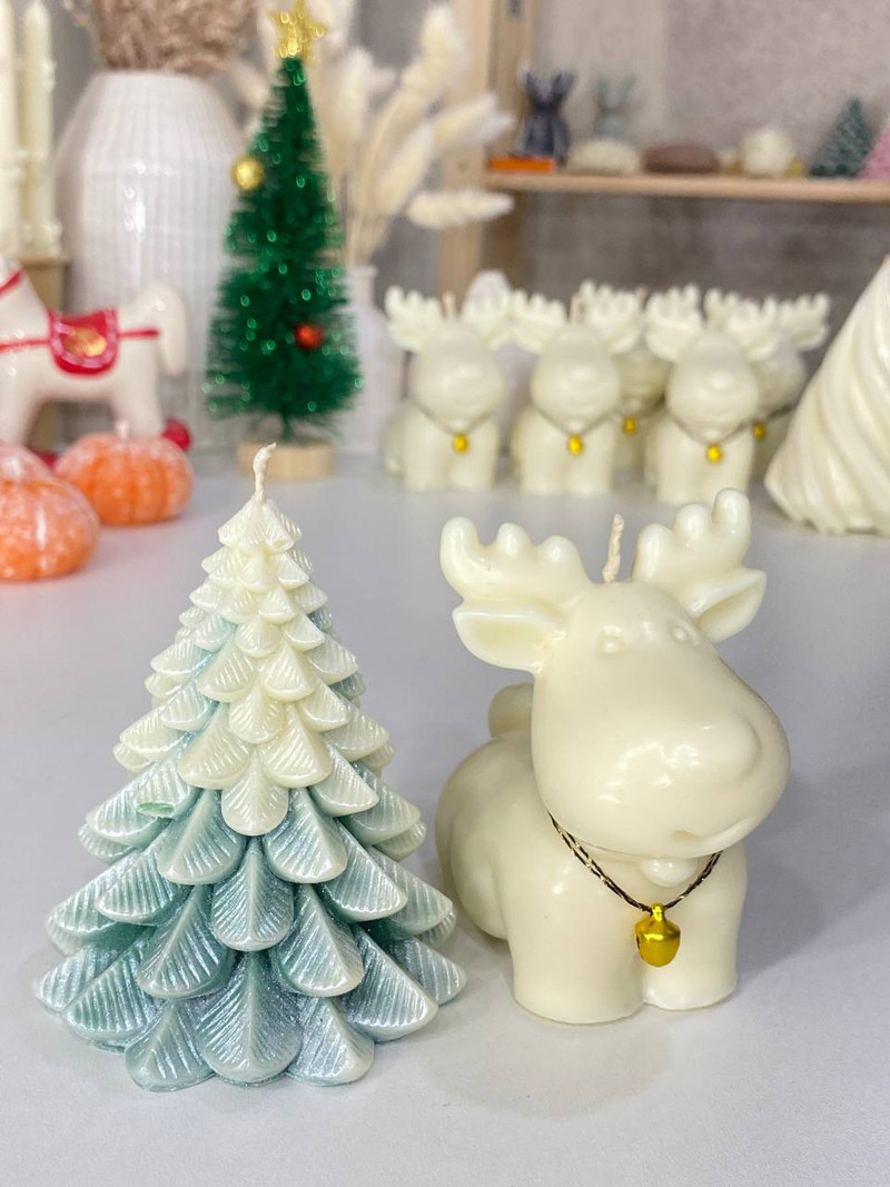Новогодняя Ель — милая свеча в форме пушистой елочки с многослойными ветвями, где воск сияет мягким светом, словно укутанная инеем в морозном лесу.