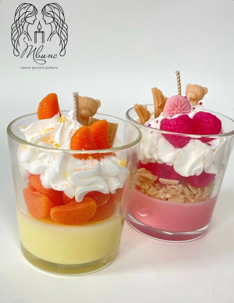 Пироженка — десерт-свеча в прозрачном стакане, где слоёный воск прячет ягоды, фрукты и крошку, а сверху — пышная шапка взбитого кремового облака.