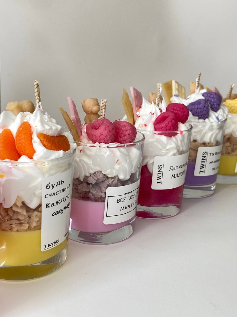 Пироженка — десерт-свеча в прозрачном стакане, где слоёный воск прячет ягоды, фрукты и крошку, а сверху — пышная шапка взбитого кремового облака.