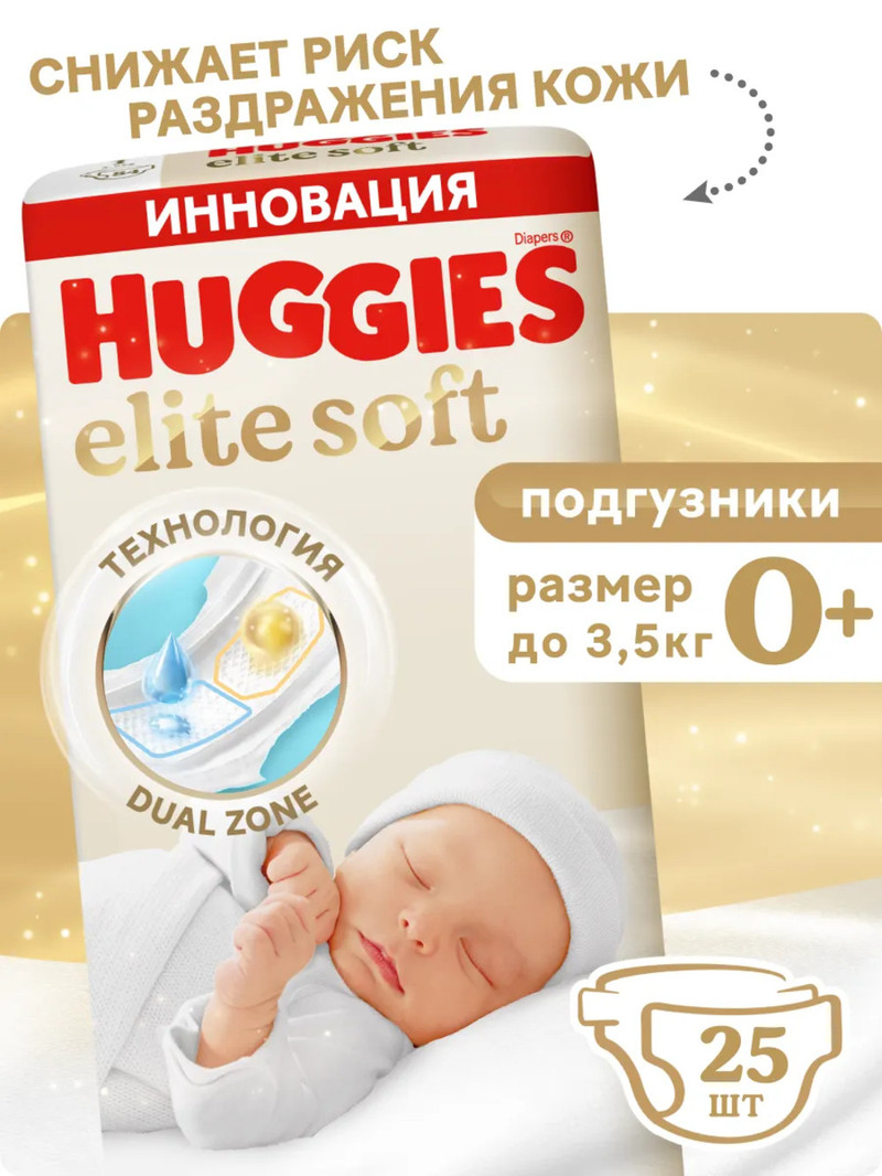 Новые подгузники для новорожденных Huggies Elite Soft 0 размера 0-3,5 кг со специальной впитывающей зоной и мягкими подушечками — это подгузники, созданные для первых дней жизни малыша. Технология Dual Zone позволяет за секунды впитывать жидкость и стул, а мягкие подушечки обеспечивают комфорт и отсутствие раздражения на нежной и чувствительной коже новорожденных. Возьмите с собой в роддом! Подгузники Хаггис Элит Софт 0+ для новорождённых гипоаллергенны, протестированы дерматологами. Подойдут для чувствительной кожи новорожденного малыша — как для мальчиков, так и для девочек. В каждой упаковке содержится 25 штук, что будет достаточно для использования в роддоме.