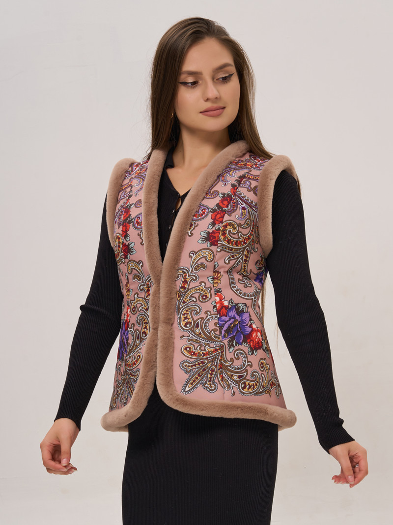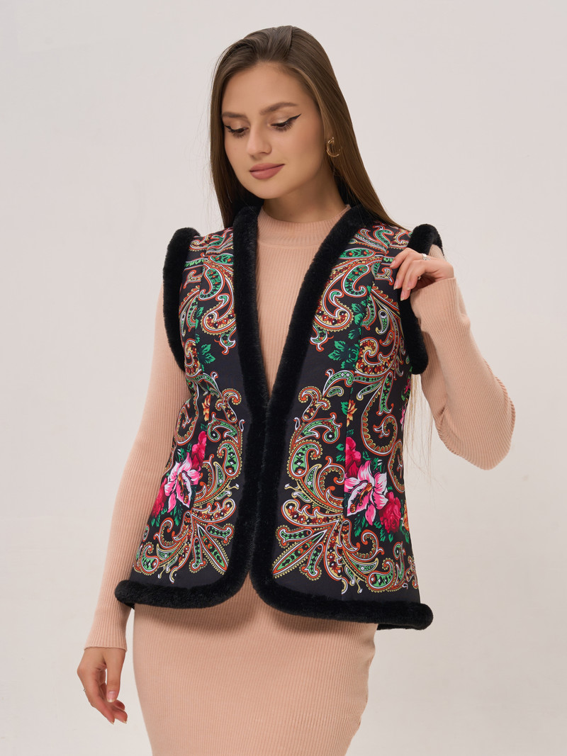 Жилет женский. Выполнен в Русском стиле. Утеплен синтепоном, подкладка-шелк, опушка из искусственного меха, застежка-крючки.