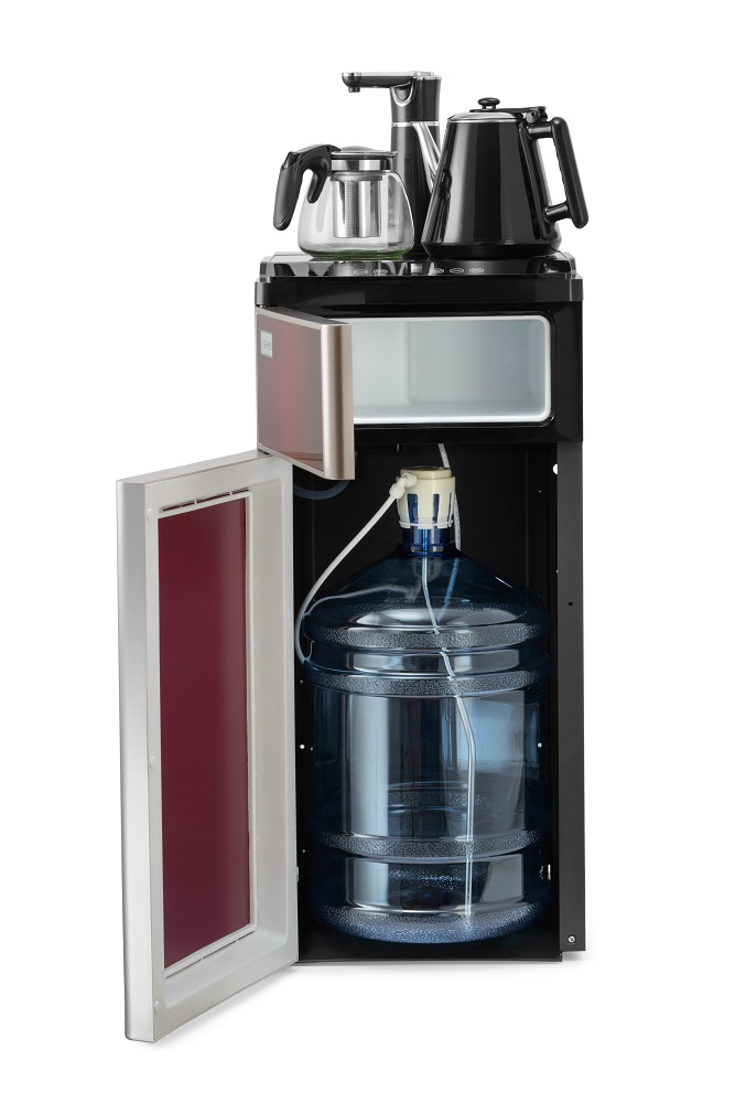 Техническая новинка кулера с нижней загрузкой бутыли. Кулер с чайным столиком. Подача воды осуществляется через кран, установленный в верхней части аппарата.