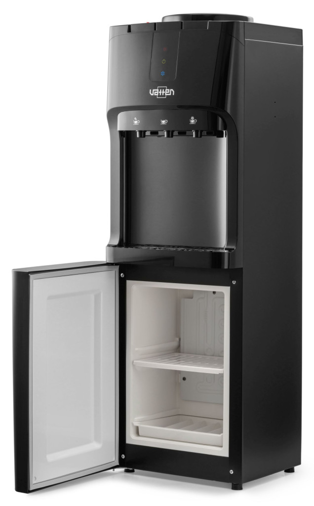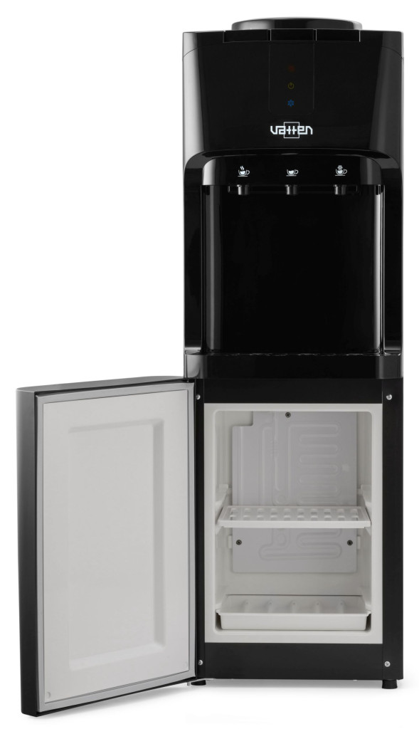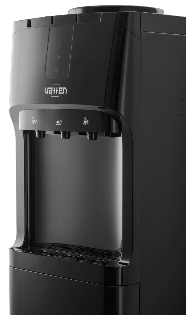 Устройство подает воду горячей, холодной и комнатной температуры. Разлив воды осуществляется нажатием на кнопку крана. Три LED индикатора (включение питания, нагрев и охлаждение).