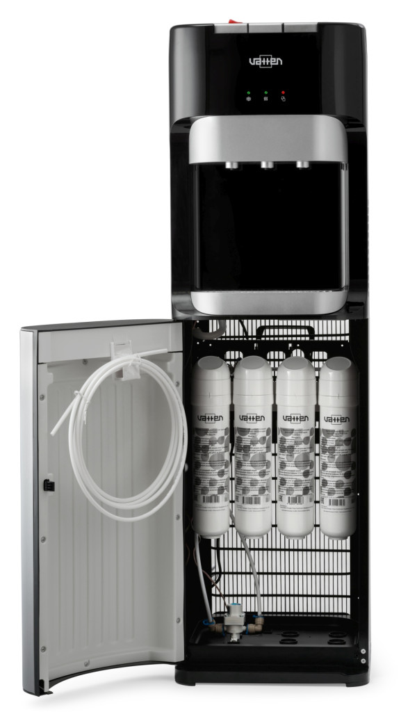 расположены на верхней передней панели черного цвета - подача питания, включение нагрева и охлаждения воды (power, hot, frost).