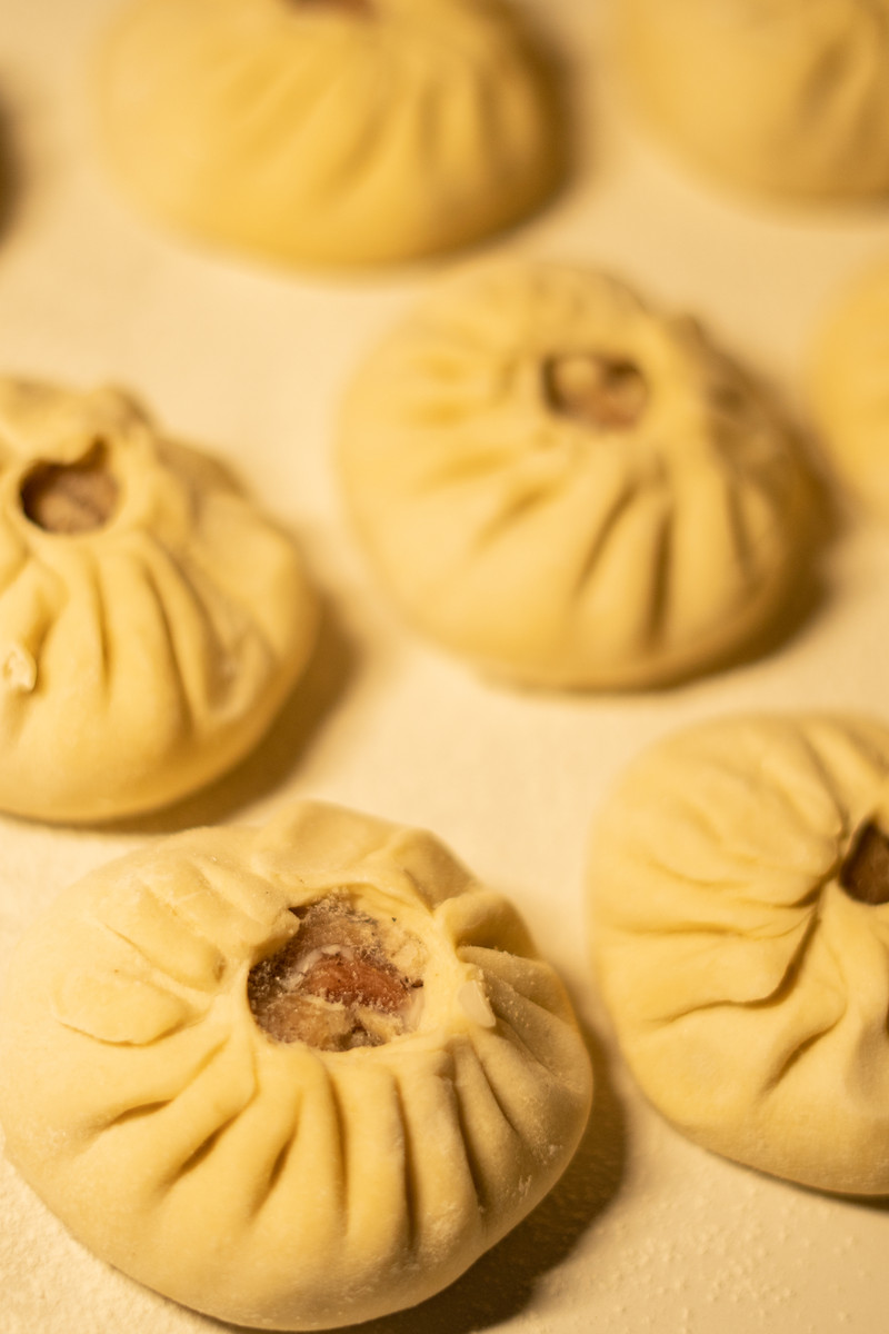 Тесто: Мука, вода, маргарин, кефир, соль Начинка: курица рубленая, картофель кубик, лук, соль, перец.