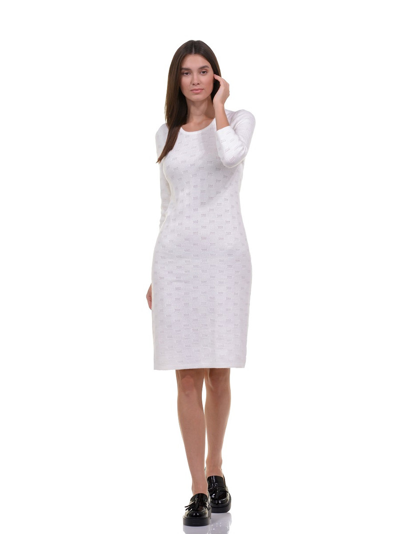 Платье женское вязаное из пряжи белого цвета с укороченных рукавом и круглым вырезом. Платье выполнено структурной вязкой в виде геометрического принта “шашечки”. Платье комфортно, универсально для повседневного ношения. Платье имеет полуприталенный силуэт за счет вытачек на спине, и это подчеркивает фигуру и не стесняет движений. Дизайн платья лаконичен и элегантен, без лишних декоративных элементов.