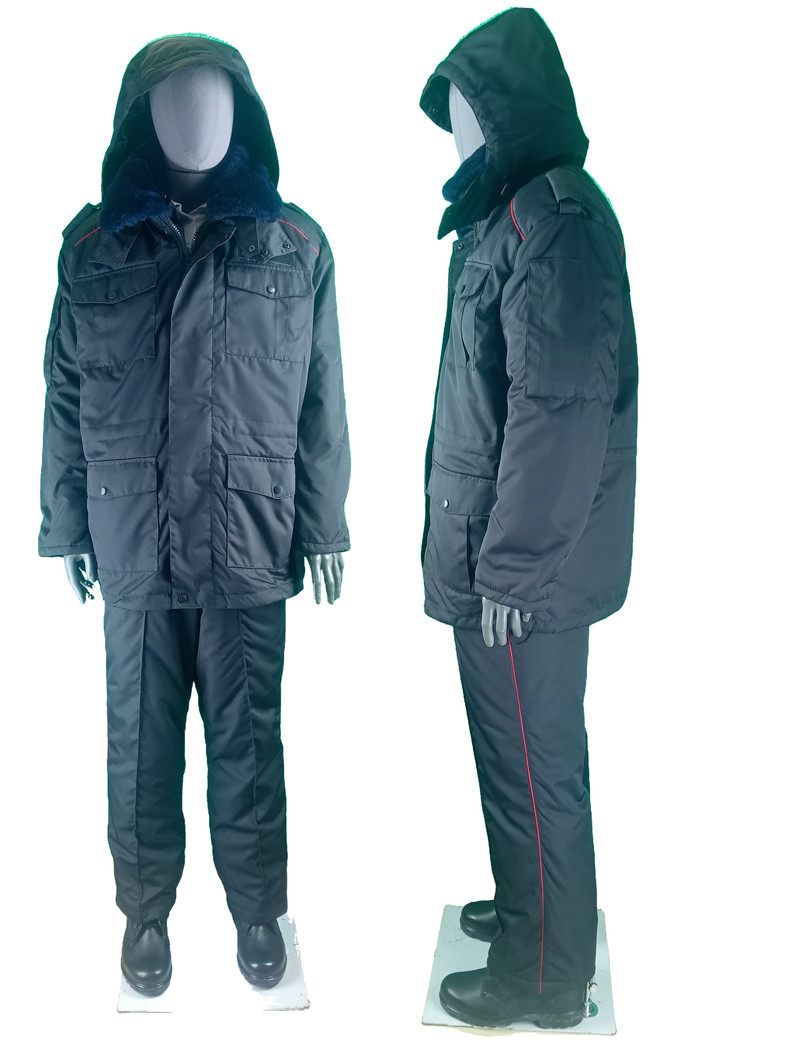 Куртка удлиненная, прямого кроя с комбинированной (притачной и съемной) утепленной подкладкой, съемным утепленным капюшоном, съемным воротником из искусственного меха. Центральная застежка на двухзамковой разъемной “молнии”, закрытой ветрозащитным клапаном на кнопках. В области плечевых швов — погоны на кнопках со съемными фальш погонами для крепления знаков различия. В области плечевого пояса кокетки, по линии кокетки втачан кант красного цвета. Съемная утепляющая подкладка с рукавами с трикотажными манжетами — напульсниками пристегивается на разъемную “молнию”.