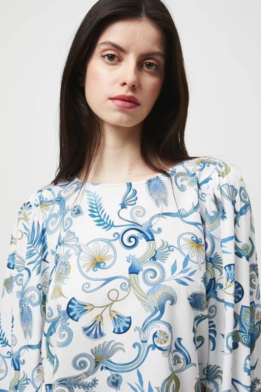 Эта блузка прямого кроя привлекает внимание изысканным орнаментом ткани и элегантным круглым вырезом горловины. Классический крой этой блузки обеспечивает свободу движений и подчеркивает достоинства фигуры. Длинные рукава с удобными эластичными манжетами добавляют практичности и позволяют носить блузку в любое время года. Особую изюминку этой модели придает завязка сзади, украшенная бисером.