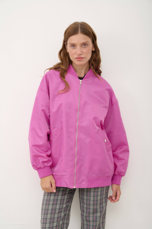 Куртка-бомбер женская, фасон оверсайз, с застежкой на молнию, прорезными карманами на кнопках по бокам, с трикотажной отделкой на вороте, манжетах объемных рукавов и по низу. Демисезонная модель из полиэстера однотонного цвета.