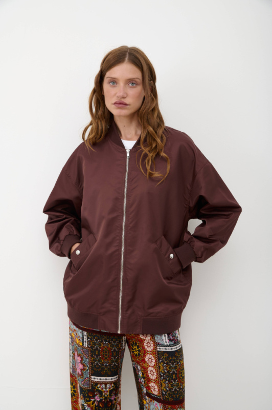 Куртка-бомбер женская, фасон оверсайз, с застежкой на молнию, прорезными карманами на кнопках по бокам, с трикотажной отделкой на вороте, манжетах объемных рукавов и по низу. Демисезонная модель из полиэстера однотонного цвета.