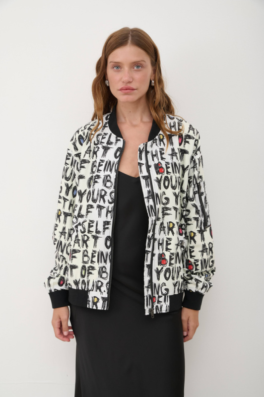 Куртка-бомбер женская фасона оверсайз, с застежкой на молнию и прорезными карманами. Модель с ярким узором мультиколор в стиле граффити, с трикотажной однотонной отделкой на вороте, по низу и на манжетах. Такая объемная куртка подарит максимальный комфорт, взяв на себя роль центра аутфита в стиле casual sport. Сочетайте ее с однотонной парой брюк или юбкой, носи с джинсами.