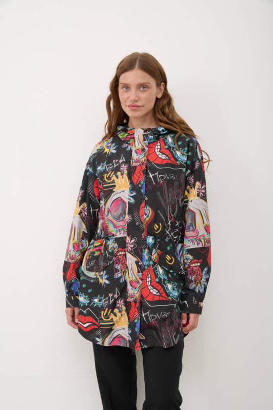 Куртка-парка женская удлиненного свободного фасона, с капюшоном, кулиской на поясе и застежкой на молнию. Накладные карманы с клапанами по бокам. Модель с монохромным узором, на подкладе. Такая парка станет незаменимой в демисезонье или прохладным летом, дополняя и однотонные брюки, и джинсы, и платья в стиле casual.